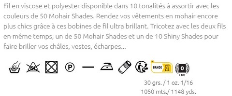 Bobine de 30 grammes et 1050 mètres. Il est conseillé de tricoter ce fil en même temps que 50 Mohair Shades et respecter ses caractéristiques. Laver à la main. Ne pas mettre au sèche-linge