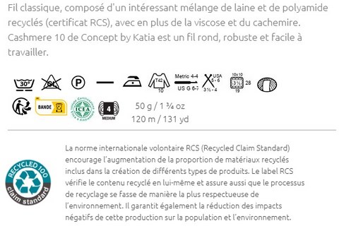 Pelote de 50 g et 120 m. Il est conseillé d'utiliser des aiguilles à tricoter 3,5-4 mm ou un crochet 4-4,5 mm. 10 pelotes pour la confection d'un pull à longues manches pour femme en T42. Echantillon de 10x10cm, tricoter 19 mailles sur 28 rangs. Lavage en machine avec un programme d'essorage court à 30°C max. Ne pas mettre au sèche-linge.