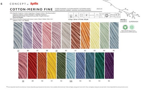 Pelote de 25 grammes et 75 mètres. C'est un fil fin pour lequel il est conseillé d'utiliser des aiguilles de 3 - 3,5 mm et un crochet de 3,5 - 4 mm. Pour un pull à longues manches pour enfant: 5 pelotes. Pour obtenir un échantillon de 10x10 cm, tricoter 23 mailles et 31 rangs. Lavage en machine avec le programme laine à 30ºC maximum. Ne pas mettre au sèche-linge.