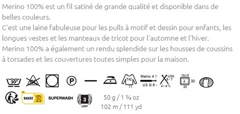Pelote de 50 grammes et de 102 mètres. C'est un fil de grosseur moyenne pour lequel il est conseillé d'utiliser des aiguilles ou un crochet 4-4,5 mm. Pour un pull à longues manches pour femme taille 42: 11 pelotes. Pour obtenir un échantillon de 10x10 cm, tricoter 23 mailles sur 30 rangs. Lavage en machine avec le programme laine à 30ºC maximum.