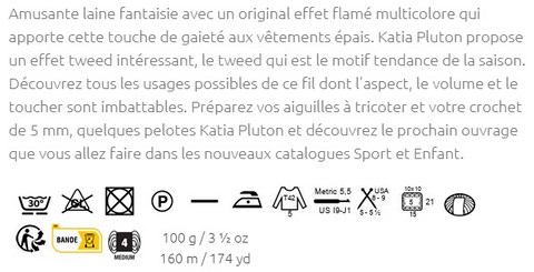 Pelote de 100 g et 160 m. Il est conseillé d'utiliser des aiguilles à tricoter de 5-5,5 mm ou un crochet de 5,5-6 mm. 5 pelotes sont nécessaires pour la confection d'un pull à longues manches pour femme en taille 42. Pour obtenir un échantillon de 10x10cm, tricoter 15 mailles sur 21 rangs. Lavage en machine avec un cycle laine à 30°C maximum. Ne pas mettre au sèche-linge.