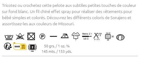 Pelote de 50 grammes et 145 mètres. Il est conseillé d'utiliser des aiguilles à tricoter de 3 - 3 et demi ou un crochet de 2,5 - 3. 7 pelotes sont nécessaires pour la confection d'un pull à courtes manches pour femme en taille 42. Pour obtenir un échantillon de 10x10cm, tricoter 22 mailles sur 30 rangs. Lavable en machine.