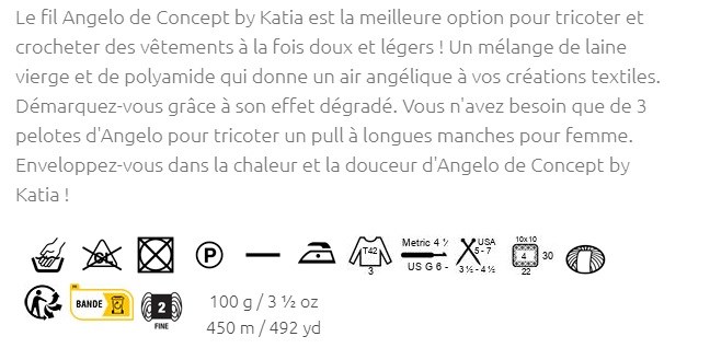 Pelote de 100 grammes et 450 mètres. Il est conseillé d'utiliser des aiguilles à tricoter 3,5-4,5 mm ou un crochet 4,5-5 mm. 3 pelotes sont nécessaires pour la confection d'un pull à longues manches pour femme en taille 42. Pour obtenir un échantillon de 10x10cm, tricoter 22 mailles sur 30 rangs. Laver à la main. Ne pas mettre au sèche-linge.