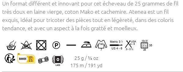 Pelote de 25 grammes et 175 mètres. Il est conseillé d'utiliser des aiguilles à tricoter de 3-3,5 mm ou un crochet de 3,5-4 mm. 7 pelotes sont nécessaires pour la confection d'un pull à longues manches pour femme en taille 42. Pour obtenir un échantillon de 10x10cm, tricoter 25 mailles sur 35 rangs. Laver à la main. Ne pas mettre au sèche-linge.