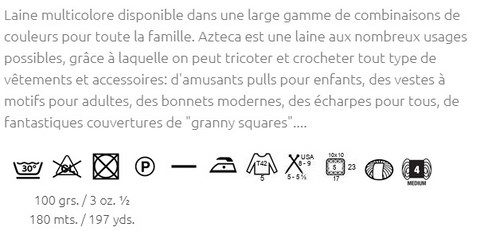 Pelote de 100 grammes et de 180 mètres. C'est un fil de grosseur moyenne pour lequel il est conseillé d'utiliser des aiguilles ou un crochet de 5-5,5 mm. Pour un pull à longues manches pour femme taille 42: 5 pelotes. Pour obtenir un échantillon de 10x10 cm,tricoter 17 mailles sur 23 rangs. Lavage à 30ºC maximum. Ne pas mettre au sèche-linge.