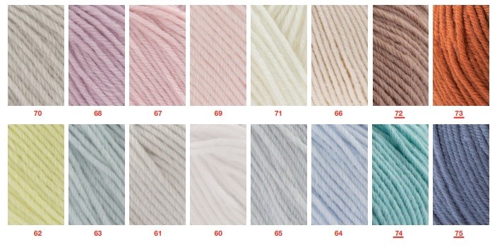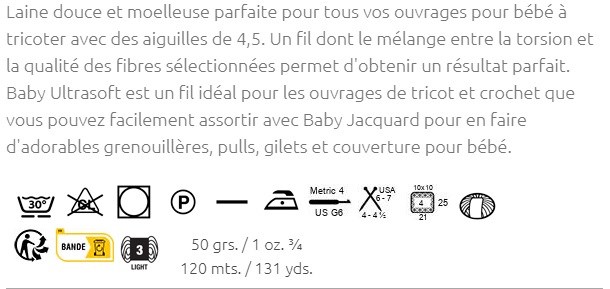 Pelote de 50 grammes et de 120 mètres. C'est un fil fin pour lequel il est conseillé d'utiliser des aiguilles ou un crochet de 4 - 4,5 mm. Pour obtenir un échantillon de 10x10 cm, tricoter 21 mailles sur 25 rangs. Lavage en machine avec le programme laine à 30ºC maximum. Séchage en machine.