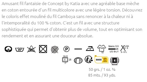Pelote de 50 grammes et 85 mètres. Il est conseillé d'utiliser des aiguilles à tricoter de 5-5,5 mm ou un crochet de 5,5-6 mm. 10 pelotes sont nécessaires pour la confection d'un pull à longues manches pour femme en taille 42. Pour obtenir un échantillon de 10x10cm, tricoter 17 mailles sur 25 rangs. Lavage en machine à 30°C maximum.