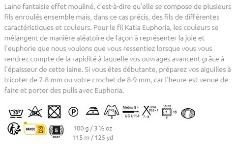 Pelote de 100 g et 115 m. Il est conseillé d'utiliser des aiguilles à tricoter de 7-8 mm ou un crochet de 8-9 mm. 6 pelotes sont nécessaires pour la confection d'un pull à longues manches pour femme en taille 42. Pour obtenir un échantillon de 10x10cm, tricoter 11 mailles sur 16 rangs. Lavage en machine avec un cycle laine à 30°C maximum. Ne pas mettre au sèche-linge.