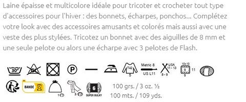 Pelote de 100 grammes et 100 mètres. C'est un fil épais pour lequel il est conseillé d'utiliser des aiguilles de 8-9 mm et un crochet de 8 mm. Pour un pull à longues manches pour femme taille 42: 5 pelotes. Pour obtenir un échantillon de 10x10 cm, tricoter 9 mailles et 11 rangs. Lavage en machine à 30ºC maximum. Ne pas mettre au sèche-linge.