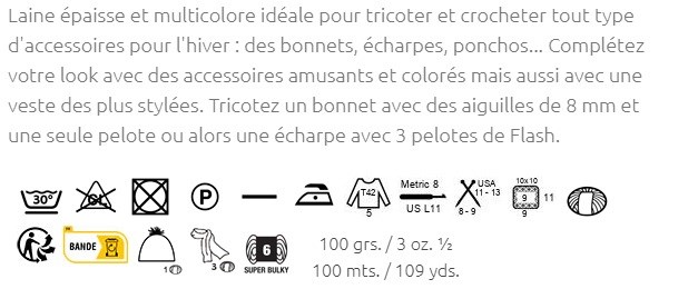 Pelote de 100 grammes et 100 mètres. C'est un fil épais pour lequel il est conseillé d'utiliser des aiguilles de 8-9 mm et un crochet de 8 mm. Pour un pull à longues manches pour femme taille 42: 5 pelotes. Pour obtenir un échantillon de 10x10 cm, tricoter 9 mailles et 11 rangs. Lavage en machine à 30ºC maximum. Ne pas mettre au sèche-linge.