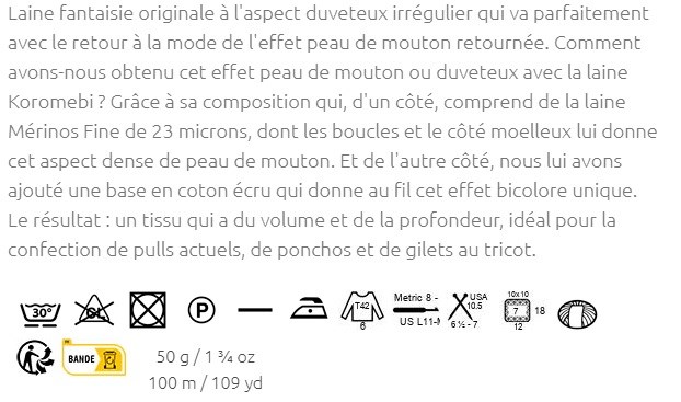 Pelote de 50 g et 100 mètres. Il est conseillé d'utiliser des aiguilles à tricoter de 6,5-7 mm ou un crochet de 8-9 mm. 6 pelotes sont nécessaires pour la confection d'un pull à longues manches pour femme en taille 42. Pour obtenir un échantillon de 10x10cm, tricoter 12 mailles sur 18 rangs. Lavage en machine avec un cycle laine à 30°C max. Ne pas mettre au sèche-linge.