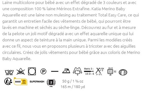 Pelote de 50 g et 165 m. Il est conseillé d'utiliser des aiguilles à tricoter de 3-3,5 mm ou un crochet de 3-3,5 mm. 9 pelotes pour la confection d'un pull à longues manches pour femme en taille 42. échantillon de 10x10cm, tricoter 26 mailles sur 32 rangs. Lavage en machine avec un programme d'essorage court à 30°C max. Séchage en machine.