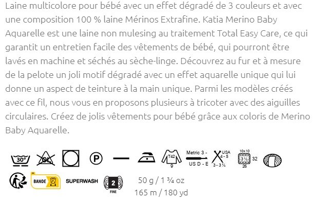 Pelote de 50 g et 165 m. Il est conseillé d'utiliser des aiguilles à tricoter de 3-3,5 mm ou un crochet de 3-3,5 mm. 9 pelotes pour la confection d'un pull à longues manches pour femme en taille 42. échantillon de 10x10cm, tricoter 26 mailles sur 32 rangs. Lavage en machine avec un programme d'essorage court à 30°C max. Séchage en machine.
