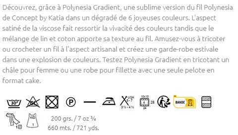Pelote de 200 grammes et 660 mètres. Il est conseillé d'utiliser des aiguilles à tricoter de 3,5-4,5 mm / US 5-7. Une pelote est suffisante pour tricoter une écharpe. échantillon de 10x10cm, tricoter 24 mailles sur 28 rangs. Lavage en machine à 30°C