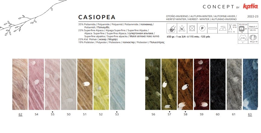 Pelote de 50 grammes et de 90 mètres. C'est un fil de grosseur moyenne pour lequel il est conseillé d'utiliser des aiguilles ou un crochet de 5,5-6 mm. Pour un pull à longues manches pour femme taille 42: 9 pelotes. Pour obtenir un échantillon de 10x10 cm, tricoter 14 mailles sur 19 rangs. Lavage en machine à 30ºC maximum.