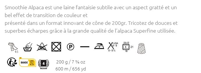 Pelote de 200 grammes et 600 mètres. Il est conseillé d'utiliser des aiguilles à tricoter 5-5,5 mm. Une pelote est suffisante pour tricoter une écharpe. Pour obtenir un échantillon de 10x10cm, tricoter 18 mailles sur 21 rangs. Laver à la main. Ne pas mettre au sèche-linge.