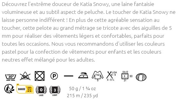 Pelote de 50 grammes et 215 mètres. Il est conseillé d'utiliser des aiguilles à tricoter de 5-5,5 mm. 5 pelotes sont nécessaires pour la confection d'un pull à longues manches pour femme en taille 42. Pour obtenir un échantillon de 10x10cm, tricoter 21 mailles sur 30 rangs. Lavage en machine avec un cycle laine à 30°C maximum. Ne pas mettre au sèche-linge.