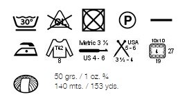 Pelote de 500 grammes et 105 mètres. C'est un fil épais pour lequel il est conseillé d'utiliser un crochet de 10-12 mm. Lavage en machine à 30ºC maximum. Ne pas mettre au sèche-linge.