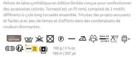 Pelote de 100 grammes et 190 mètres. Il est conseillé d'utiliser des aiguilles à tricoter de 4,5-5 mm ou un crochet de 5-5,5 mm. 5 pelotes sont nécessaires pour la confection d'un pull à longues manches pour femme en taille 42. Pour obtenir un échantillon de 10x10cm, tricoter 18 mailles sur 24 rangs. Lavage en machine à 30°C maximum. Ne pas mettre au sèche-linge.